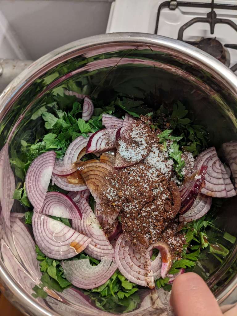 I said Biwaz is possibly the easiest salad you can make and you’re going to love it! Chop up a big bunch of parsley (~50g) coarsely. Add this to a bowl and then thinly slice a red onion. Pop this in the bowl too along with 1tbsp of olive oil, 1 1/2tsp of pomegranate molasses, 1 1/2tsp of sumac and a pinch of salt and mix it all together.