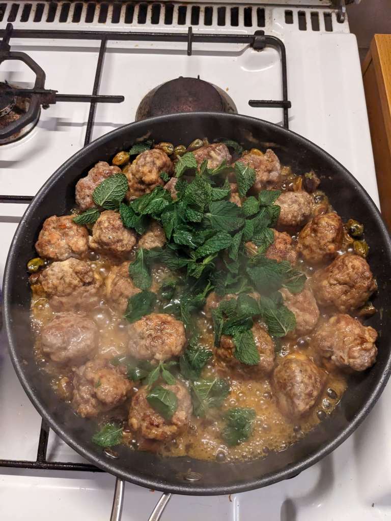 Once the meatballs are cooked, sticky and golden bown add the juice of 1/2 lemon, a small handful of mint leaves and 2tsp of rose water. Stir all those gorgeous fragrant flavours through the meatballs.