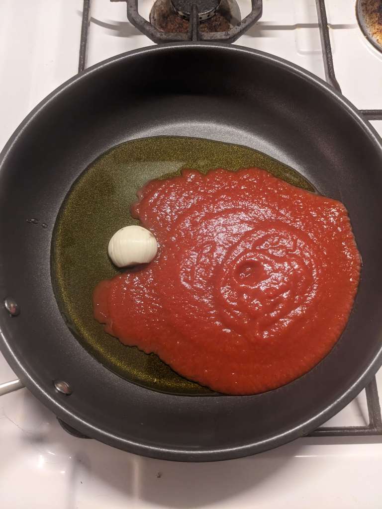 In a frying pan as big as la bella luna add 2btsp olive oil, a whole clove of garlic and a generous 200g tomato puree. Cook this slice of the tricolore for around 10 minutes.