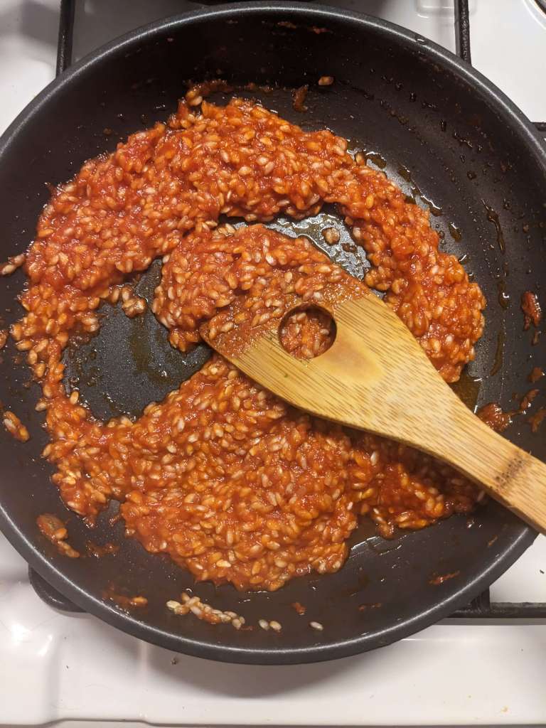Start to add the simmering broth 1-2 ladles at a time. Stir almost continually, adding more broth a ladle or two at a time, until the rice is cooked (not mushy like an Italian lover) and the mixture is liquid free but creamy.