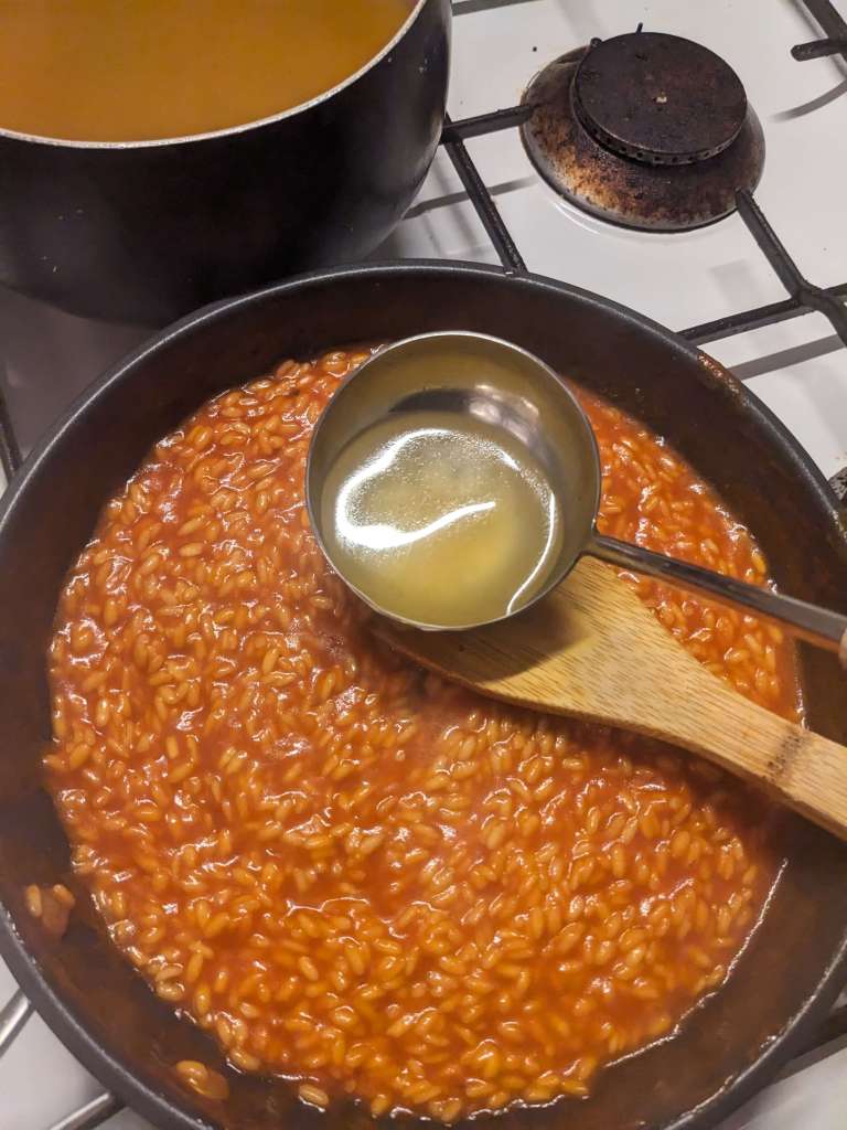 Meanwhile, heat 950ml of vegetable broth on a separate hob, allowing it to simmer away.