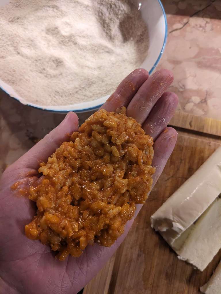 Chop your ball of mozzarella into strips around 4cm by 1cm. Once the rice has cooled enough to handle, wet your hand and place 1 1/2 heaping tablespoon of the rice mixture in the middle. (This will get very messy very quickly, don’t even attempt to touch anything in your kitchen unless you want it to look like a crime scene from Inspector Montalbano).