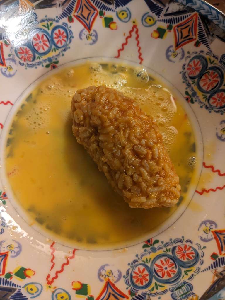 Place a stick of mozzarella in the centre, pack the rice around the mozzarella and mold into an oblong shape, making sure that the mozzarella is completely covered. Set aside on a clean plate until all Suppli are formed.