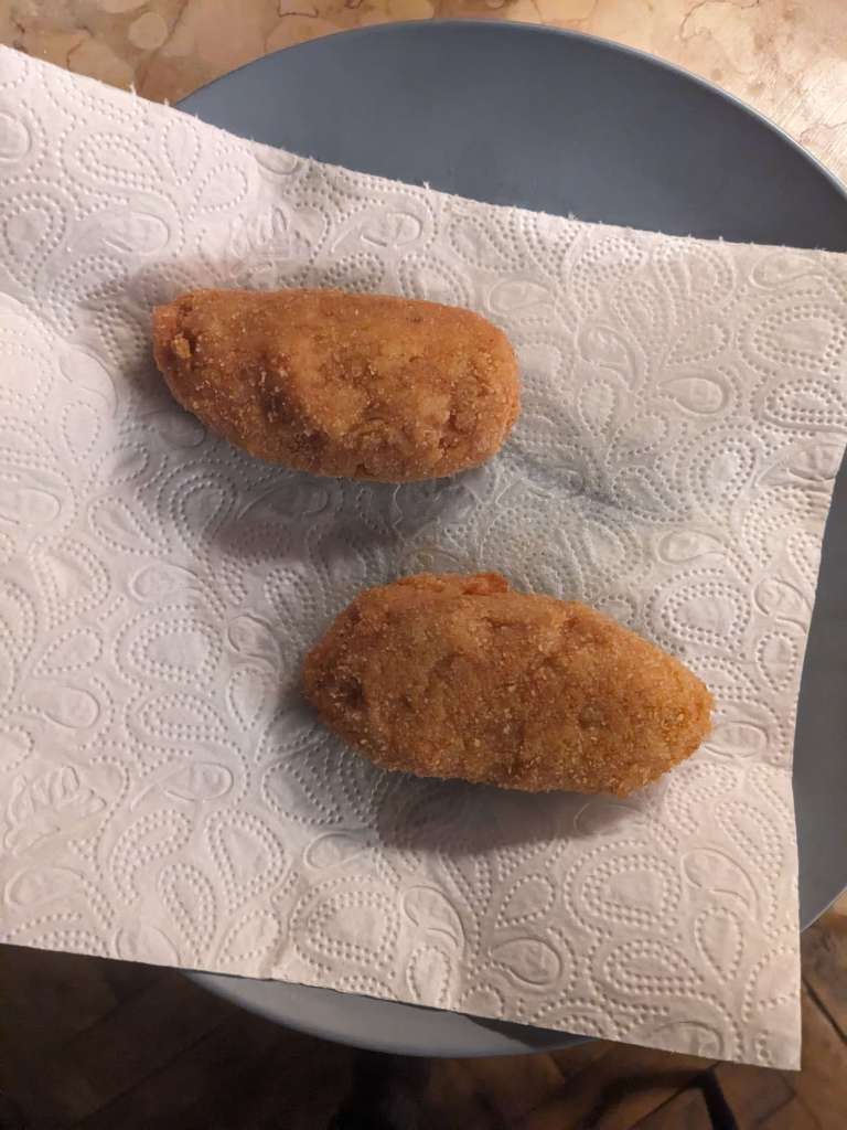 Once crispy and browned, remove the suppli with a slotted spoon and place on a plate covered with paper towels so that the oil can run off.
