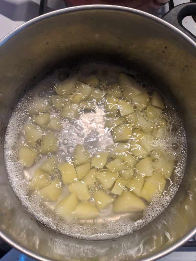 Firstly separately boil the potatoes and peas, this is because we will need to mash the potatoes! Put them both to the side once ready (oh, and mash the potatoes!)