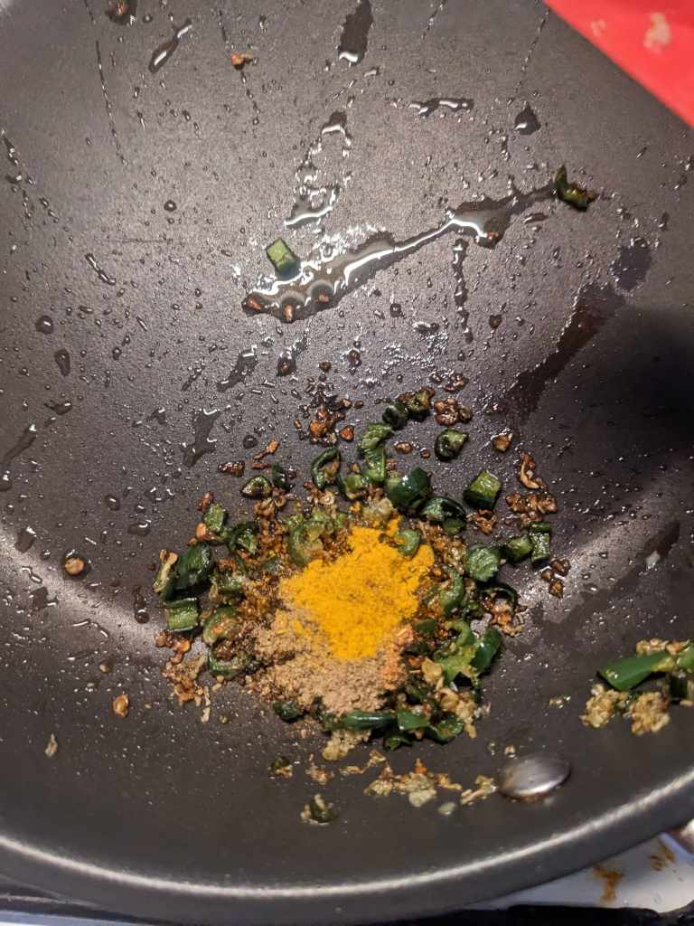 Meanwhile, in a frying pan add a splash of oil. Chop the two chillies and grate the knob of ginger and add them into the pan. Once they are fragrant, turn off the heat and add 1/2tsp chilli powder, 1/2tsp garam masala a pinch of hing and a pinch of turmeric. Stir this together