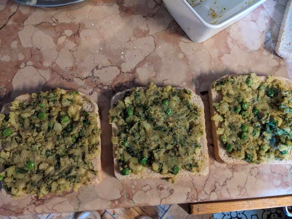 Spread out three slices of bread and share the potato filling evenly between them. Such a happy little bread family