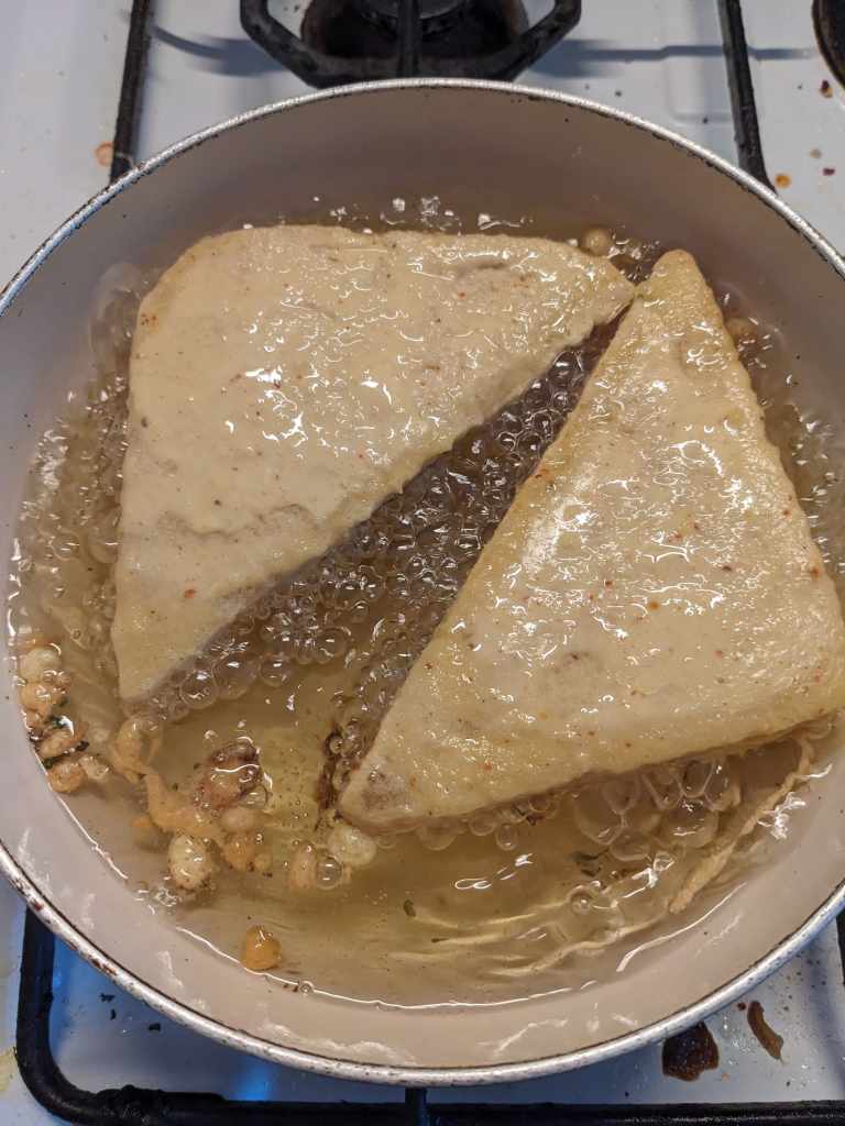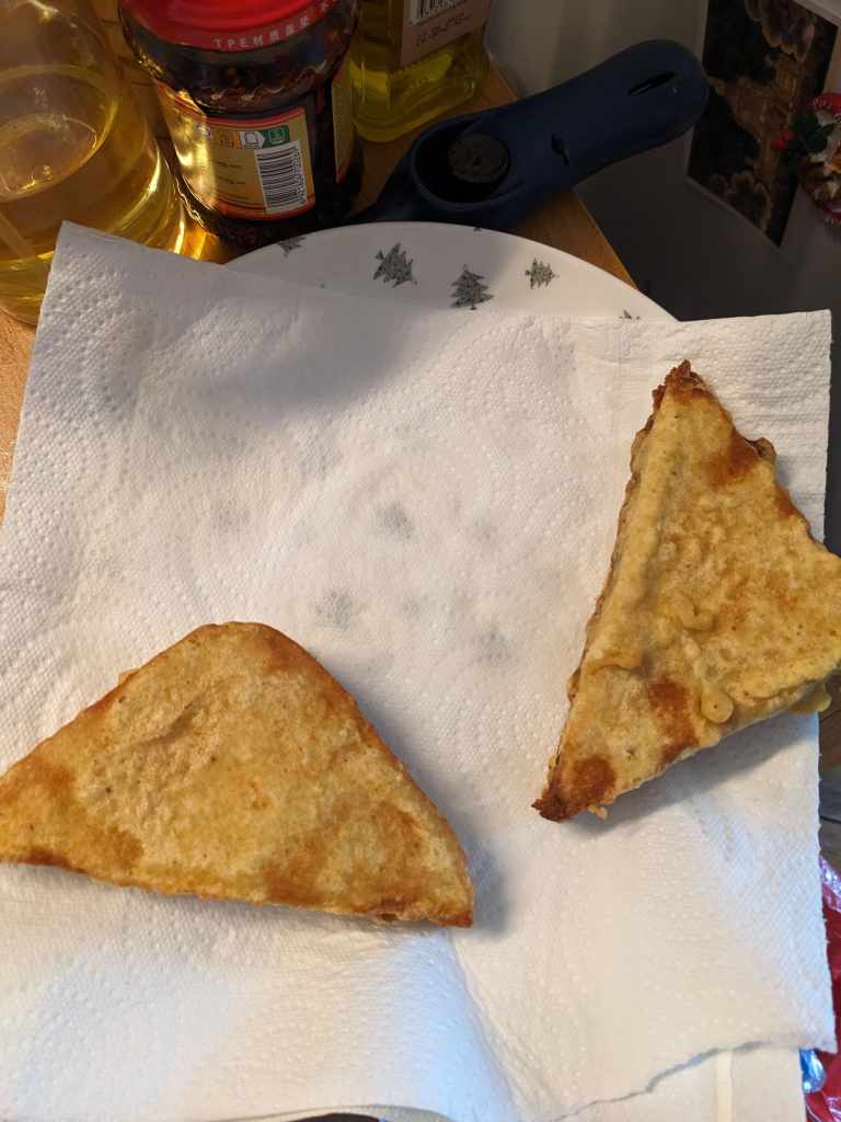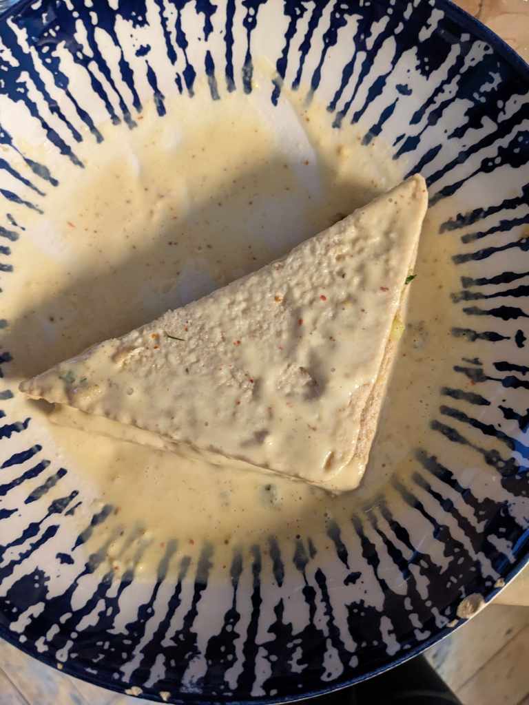 Add another slice of bread on top of each sandwich and cut them into triangles. Heat up some oil for deep frying and once it has reached temperature (a wooden spoon dipped in the oil will bubble) then it is time to start frying! Dip each triangle into the batter to coat it fully. We took a french toast approach by leaving them a few seconds to absorb some more batter