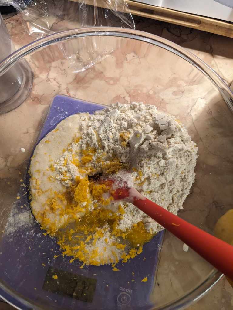 To a large bowl, add 250g strong white flour, 50g rice flour, 90g sugar and the zest of one orange. Whisk it all together. Add in the yeast mixture and knead this together.