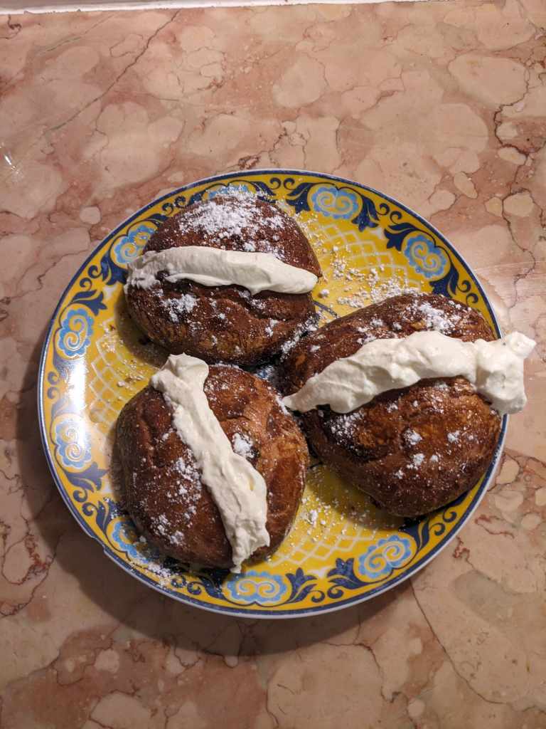 Kate says: “I think you can tell from the cover photo that I overdid my Maritozzi a little, what you can’t see is the bottom where they were overdone a LOT (as in, they kind of snapped when I cut them, not soft at all). I did like these especially the lightness of the cream, but they did not match up with the hopetaste I had in my head. They look pretty impressive though and I think with a bit of practice I could make these really well. However, I would probably just go and buy one from the shop rather than make again 5/10“