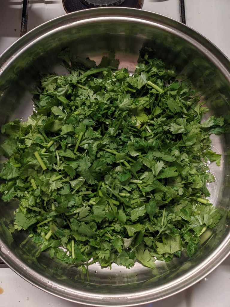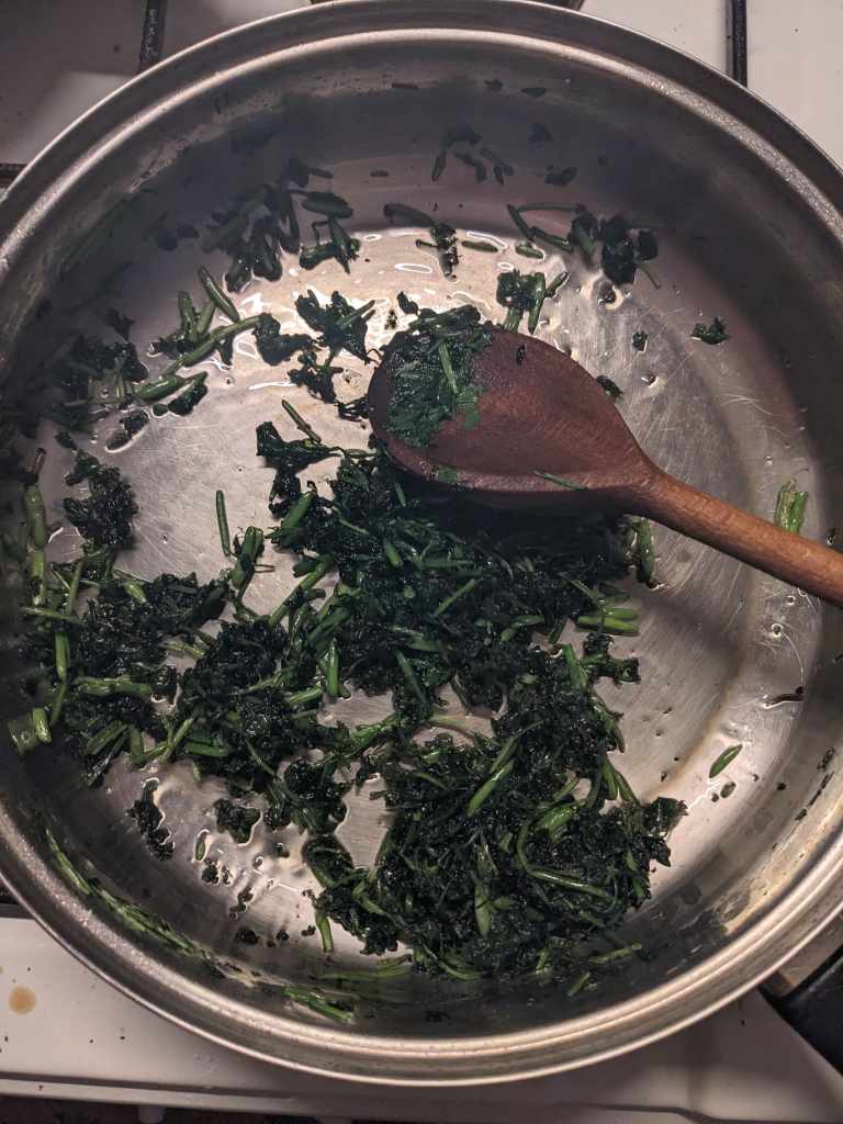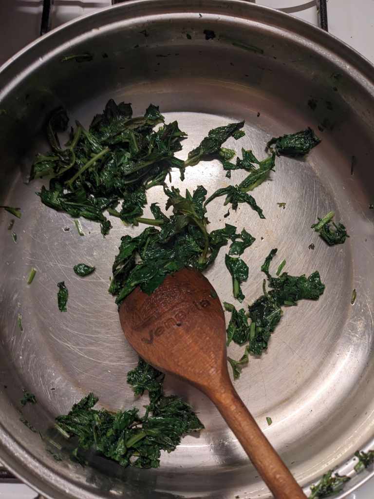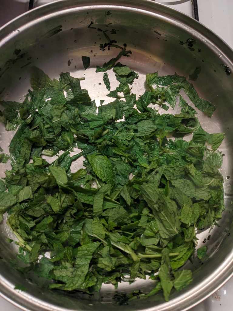 First step is to sauté the herbs. Chop the 200g parsley and 60g mint finely, keeping them separate. Fry the parsley in 3tbsp oil for about ten minutes until it is dark green and a little crispy. Take it out of the pan and then sauté the mint in 1tbsp for a couple of minutes until it has a similar consistency (about two minutes).