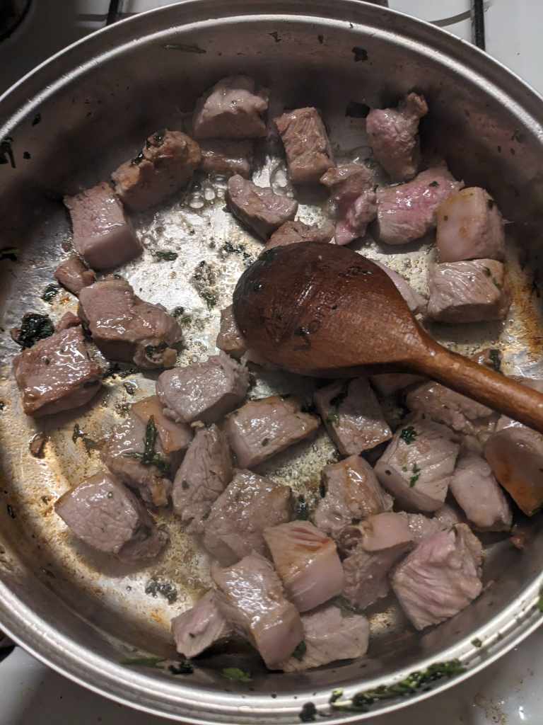 Remove the mint, and add in the 500g of lamb with some oil making sure to brown it on all sides. If your lamb is not conveniently chopped by your butcher, then it needs to be in cubes a few centimetres big (see photo)