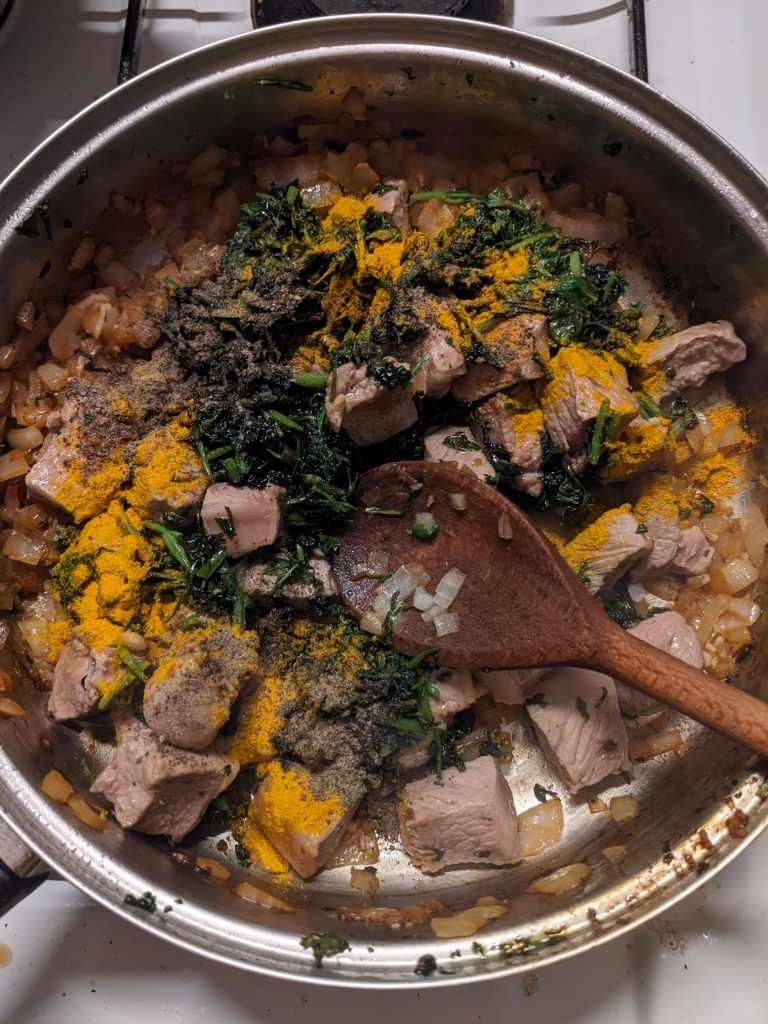 Add the herbs and meat back into the main pot along with 1tsp turmeric and 1/2tsp black pepper. Stir this together and then add 500ml of water. Leave to cook with a lid on for one and a half hours