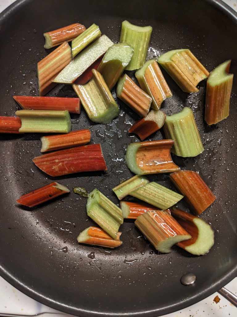 About ten minutes before the stew is finished, chop the rhubarb into about 3cm piece and fry in a frying pan for 3-5 minutes.
