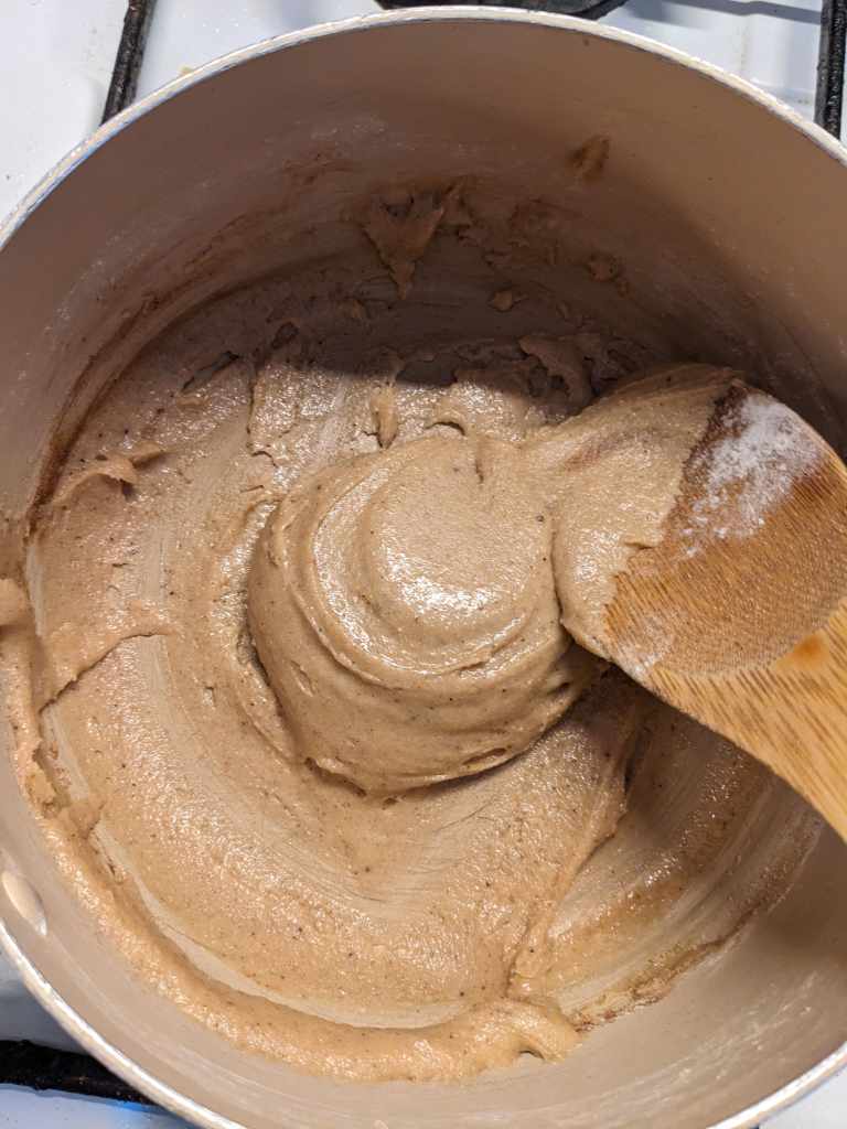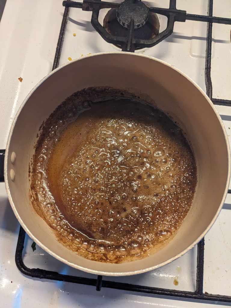 Channel your inner captain Holt and shout bone at the top of your voice as you gather your ingredients. In a saucepan, add all of the ingredients EXCEPT the flour together. Bring it to a boil and let it boil for a couple of minutes on a medium heat. The mixture will be foamy and bubbly