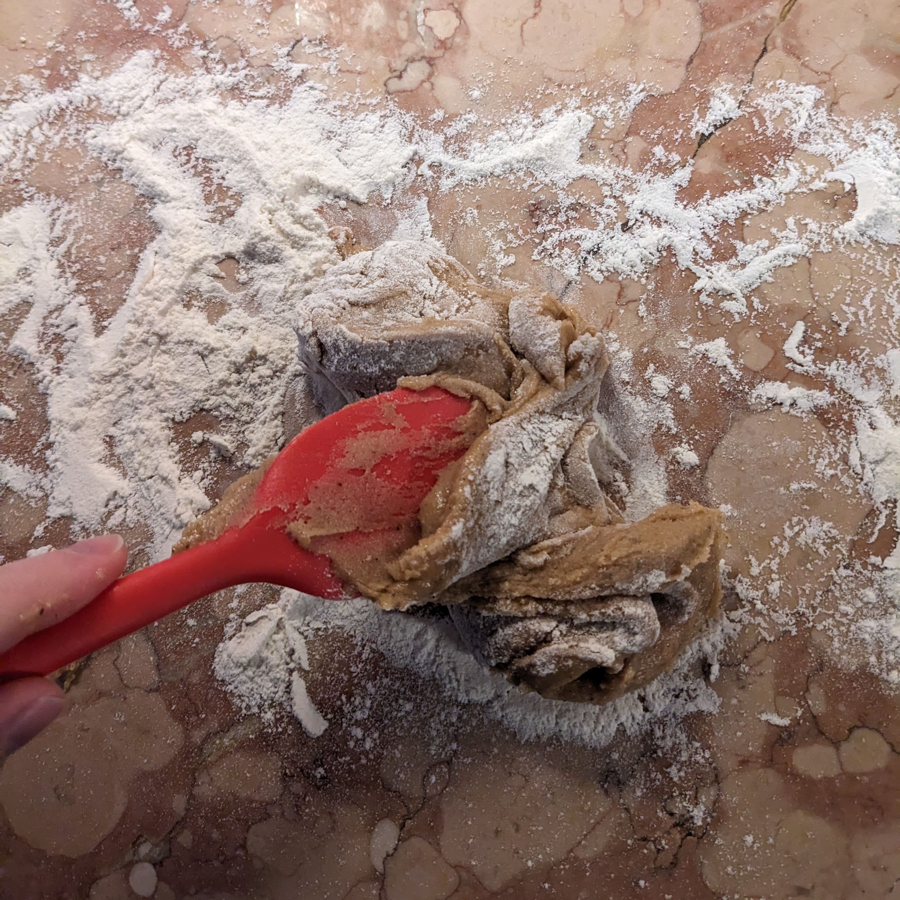 This next bit all happens quickly because we have to work with the mixture before it cools too much so make sure your work surface is clear and floured. Add the 200g of flour into the sugar mixture, turn of the heat and mix together with a wooden spoon
