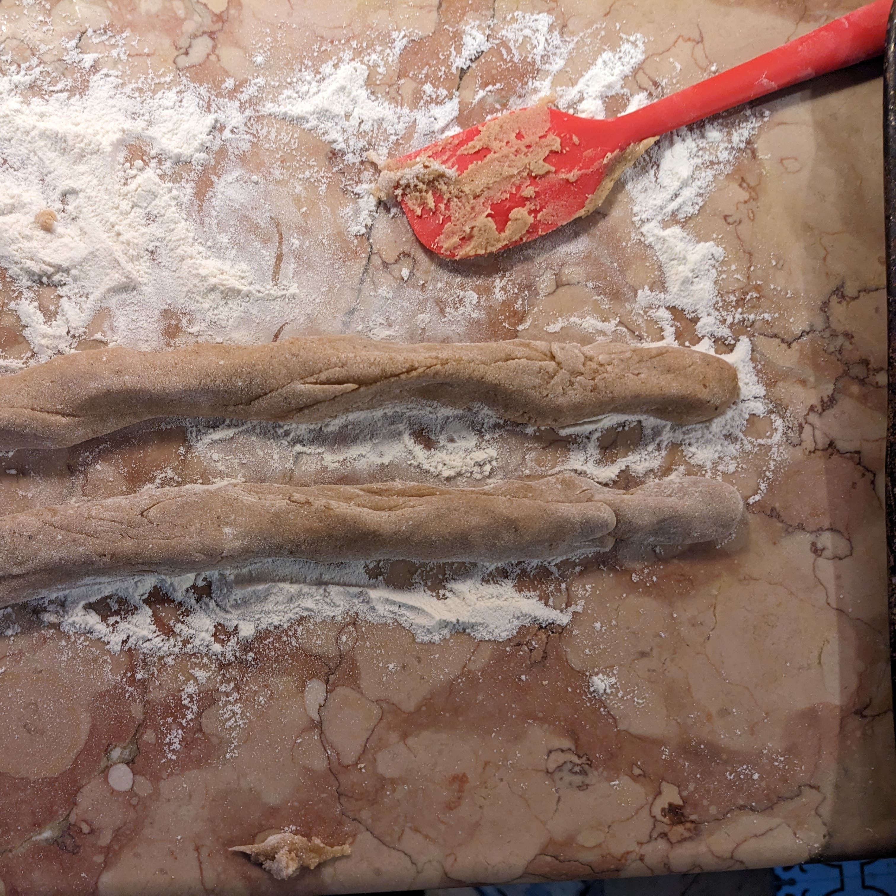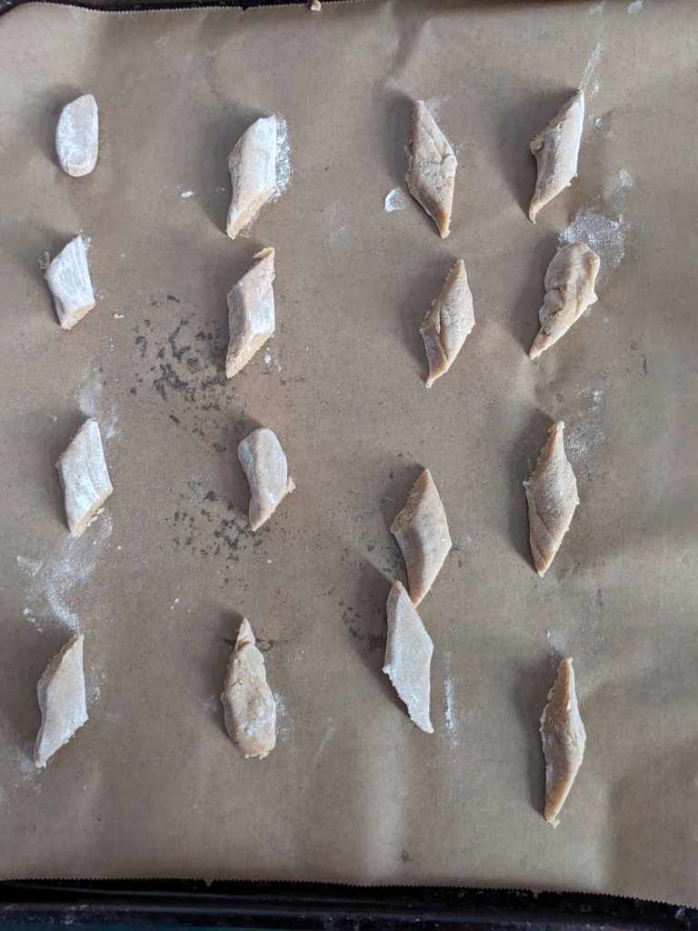 Pour this mixture on to your floured work surface and move around with a spatula a bit so it cools down slightly. Roll the mixture into two rolls and cut your bones on a diagonal to your desired size (we chose about 3cm)