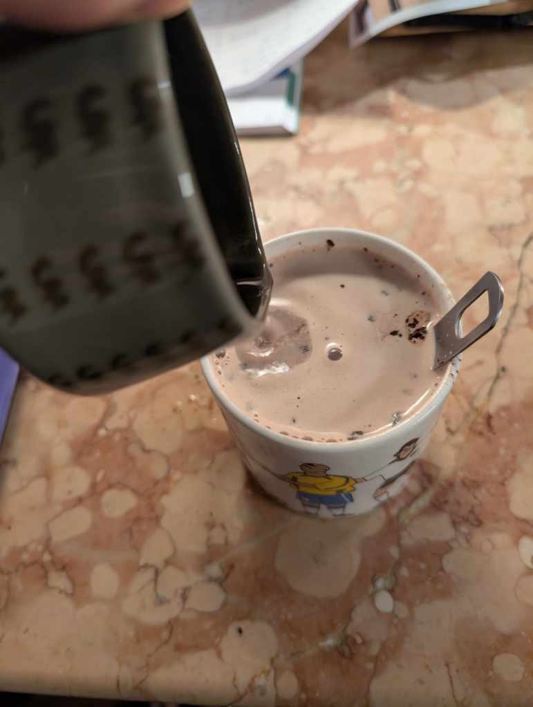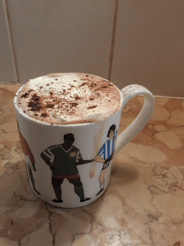 Lizzy says: “I saw this in an incredibly remote ski hut in Austria over the Christmas break and was confused why Patrice Lamumba’s name was on a drink’s machine… I was too nervous to try it there and then, so of course I put it forward to the Gasp Council for consideration. Kate and I had a fun (if brief) time making this. I used amaretto and loved the nutty fruity notes it added to the hot chocolate! I have had this a few times a week since because it is a great post-work snack 10/10”